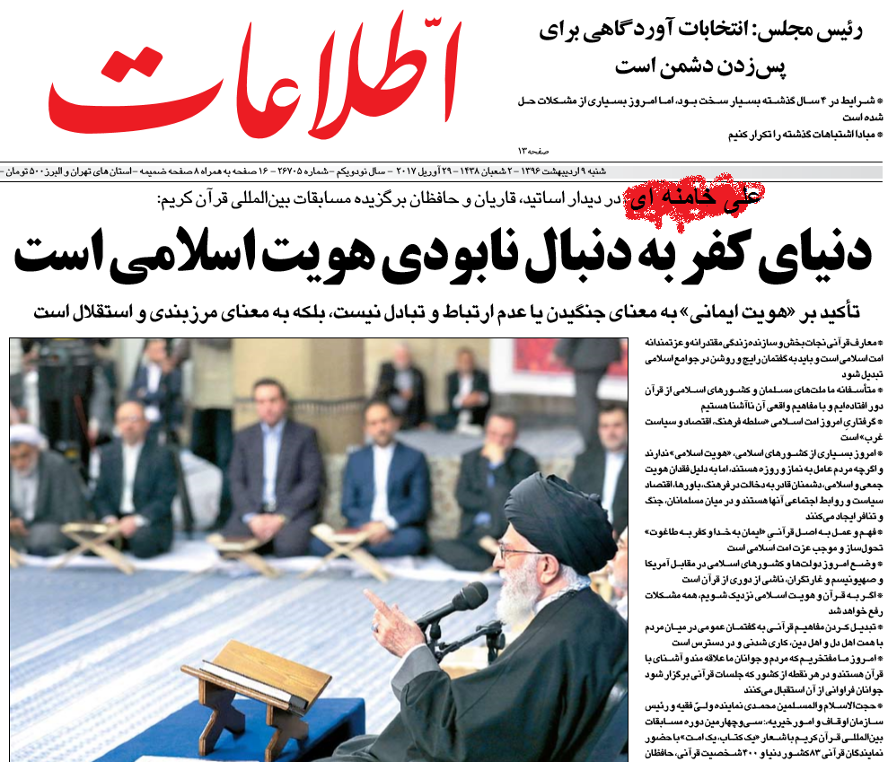 ملی یول : علی خامنه ای رئیس مادام العمر رژیم خود اسلام پندار حاکم بر تهران که در حال حاضر نیز در حال برگزاری نمایش انتخاباتی و دادن پز دموکراتیک بودن حاکمیتش است طی یک سخنرانی که بیشتر به منظور اثبات زنده بودنش پس از درج نمودن شدت گرفتن بیماری سرطانش انجام شده است ، دایره دشمن هراسی اش را باز هم وسعت بخشید و ادعا نمود که «دنیای کفر به دنبال نابودی هویت اسلامی است »